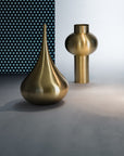 A group of floor vessels in three unique shapes. Made from brass, the Beat Vessels are spun and welded in separate parts to create their form. The finish matches Beat brass lights.