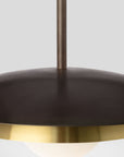 A modern re-interpretation of a 1920’s light. Hand-spun metal shades are finished in bronze and brass. Holes in the brass spinning allow light to glow within the bronze spinning creating a warm glow. The opal glass diffuses the light evenly.