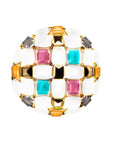 Mida is a ceiling/wall lamp with our exclusive magnetic system, inspired by the world of haute couture jewels. A pavè of precious gems encrust an almost invisible setting, and polished cabochon are geometrically scattered across a floral corolla with silky, iridescent stones. Available in five color combinations, from the flashy Multicolor, to the more versatile White/Platinum and White/Gold. Mida is fully handcrafted of white Opalflex and printed Lentiflex, whose silky morphing effect alternates with the brushed metallized “gems”. Mida makes any room extra-luxurious.