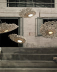 Notredame filters light like that rediating from the beautiful rose windows of a Gothic cathedral. The rosette structure of this highly decorative suspension or wall lamp is made of gold or white technopolymer. The technopolymer can be painted to fit seamlessly into the wall where the lamp is installed, creating a three-dimensional effect. The LED light source sends light directly from the central core and indirectly from the diffuser’s textured backlight. The lamp is available in two sizes and can be wall, ceiling or suspended.