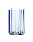 Clear glass tumblers and accessories in the Tirache collection. From the bottom of the glass, lines of alternating colours curl upwards like two-tone streamers, highlighting the thickness of the tumbler and making the shiny rims seem to quiver.